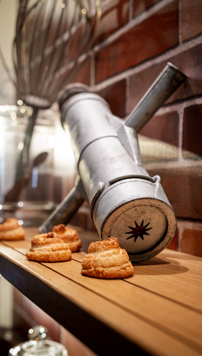 Découvrez notre espace dédié aux outils traditionnels du biscuitier, dont le batteur, le four tunnel et l’émondeuse à amandes, tous témoins d’un savoir-faire artisanal. Une reconstitution immersive vous plonge dans une biscuiterie du XIXe siècle, où chaque geste et chaque machine racontent l’histoire de la fabrication du macaron. Sur le mur des collections : tamis, balances, seringue de pâtissier et pétrin, révèlent les secrets de textures et proportions parfaites.